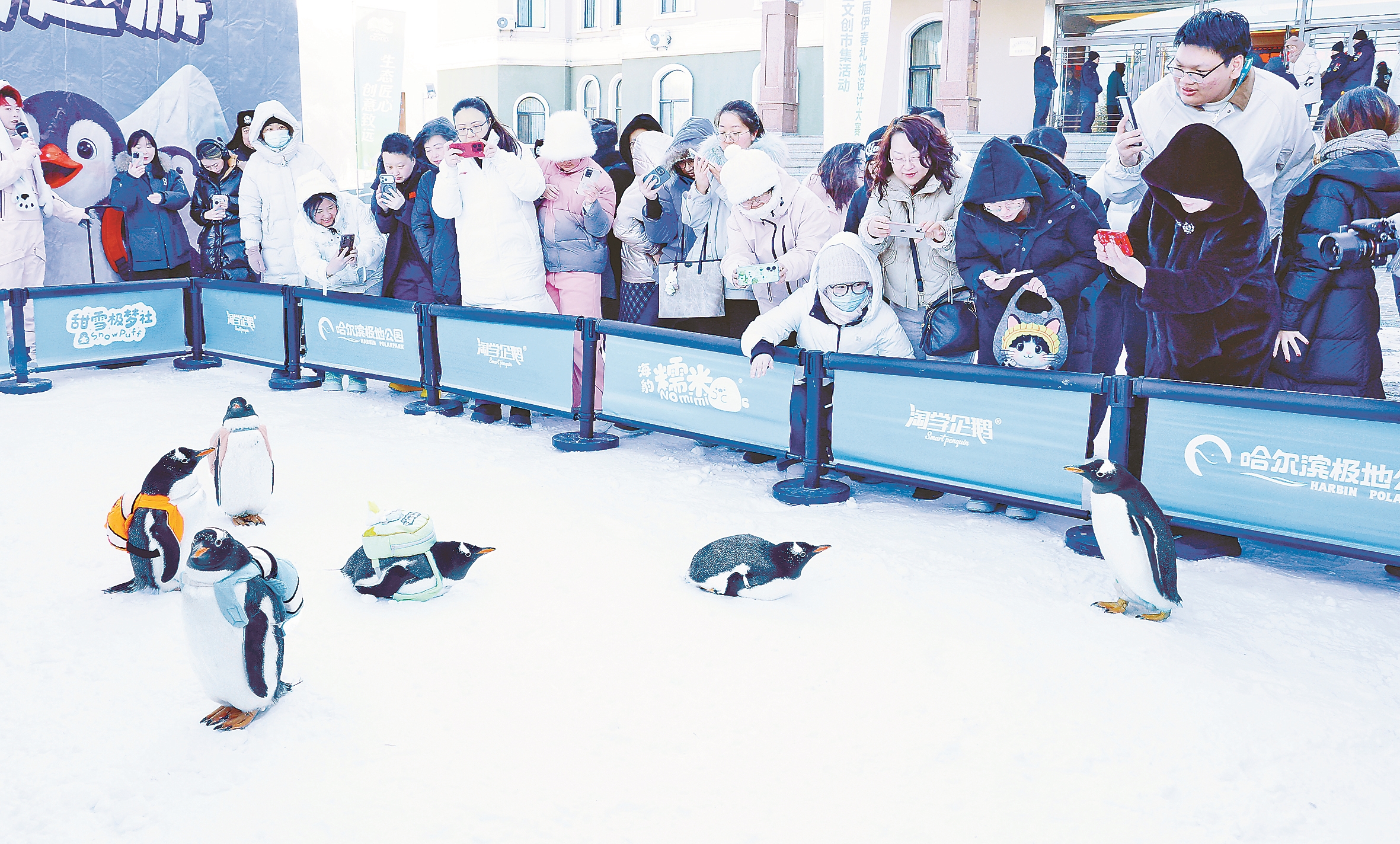 1月28日,哈尔滨极地公园的“淘学企鹅”们来到我市巡游,憨态可掬的模样瞬间引来大批市民、游客围观互动、拍照打卡,现场欢声笑语不断。