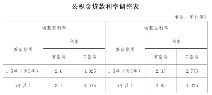 中国人民银行决定,自2024年5月18日起,下调个人住房公积金贷款利率0.25个百分点,5年以下(含5年)和5年以上首套个人住房公积金贷款利率分别调整为2.35%和2.85%,5年以下(含5年)和5年以上第二套个人住房公积金贷款利率分别调整为不低于2.775%和3.325%。