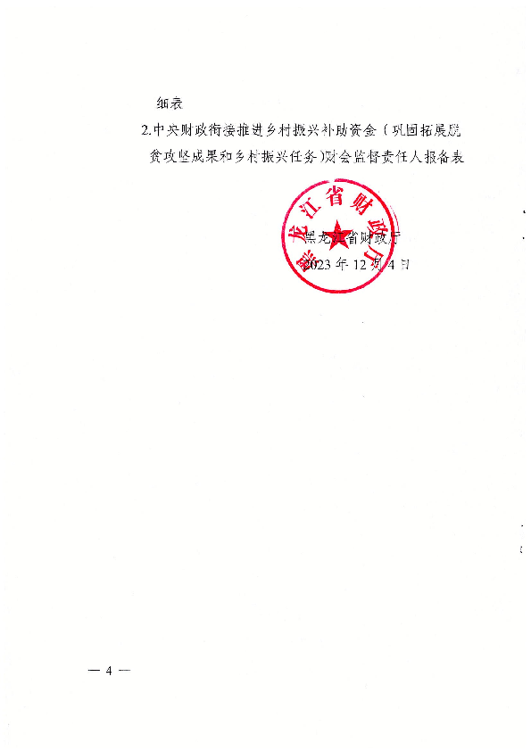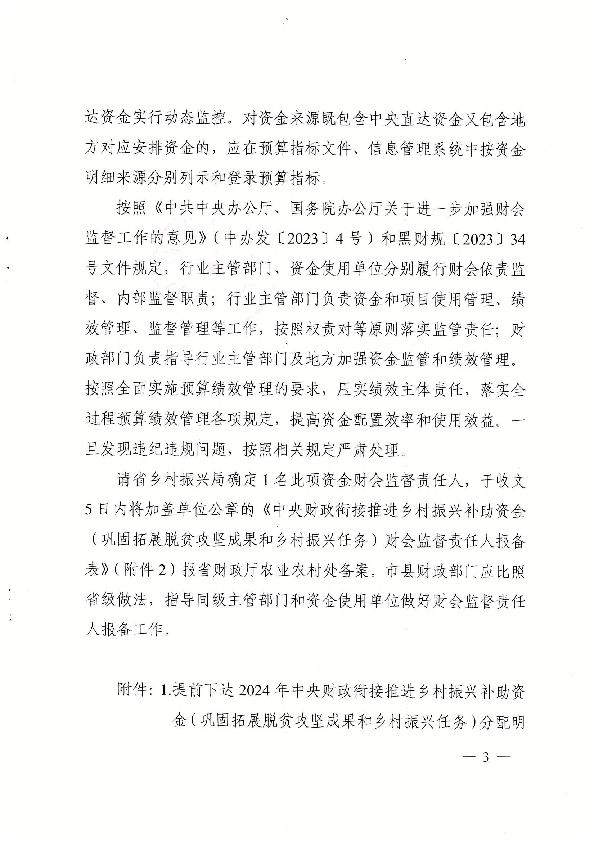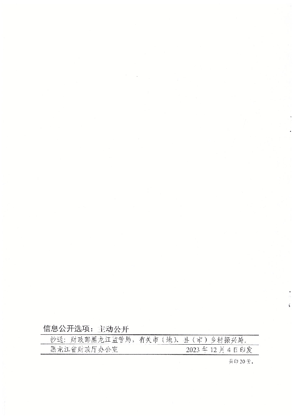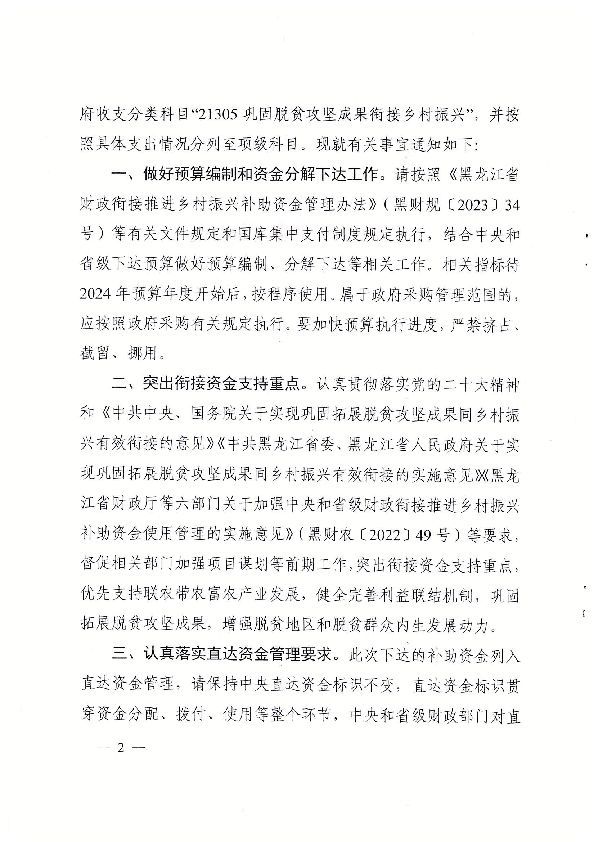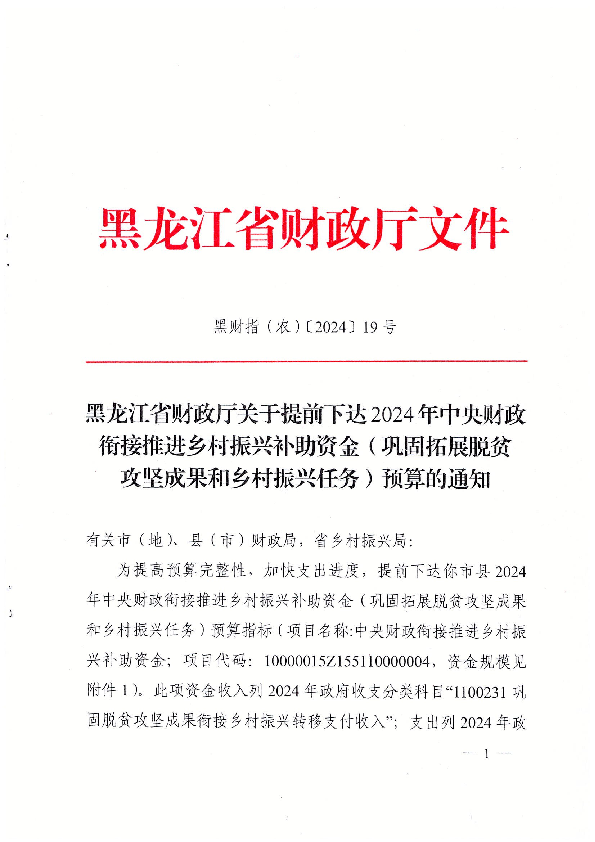 黑龙江省财政厅关于提前下达2024年中央财政衔接推进乡村振兴补助资金(巩固拓展脱贫攻坚成果和乡村振兴任务)预算的通知 (黑财指(农)〔2024〕19号)