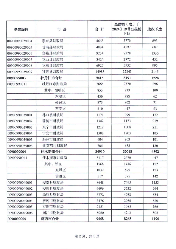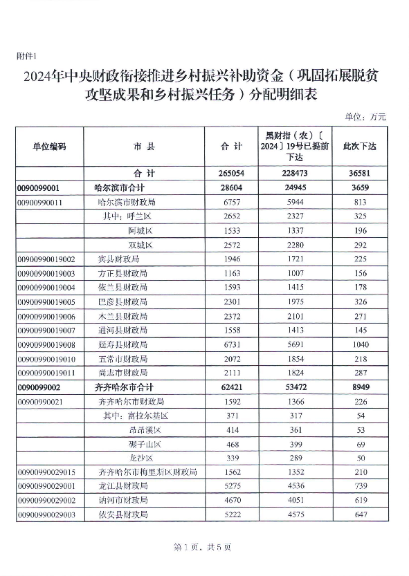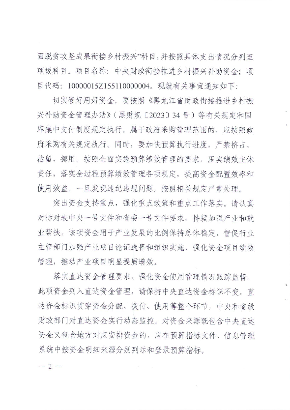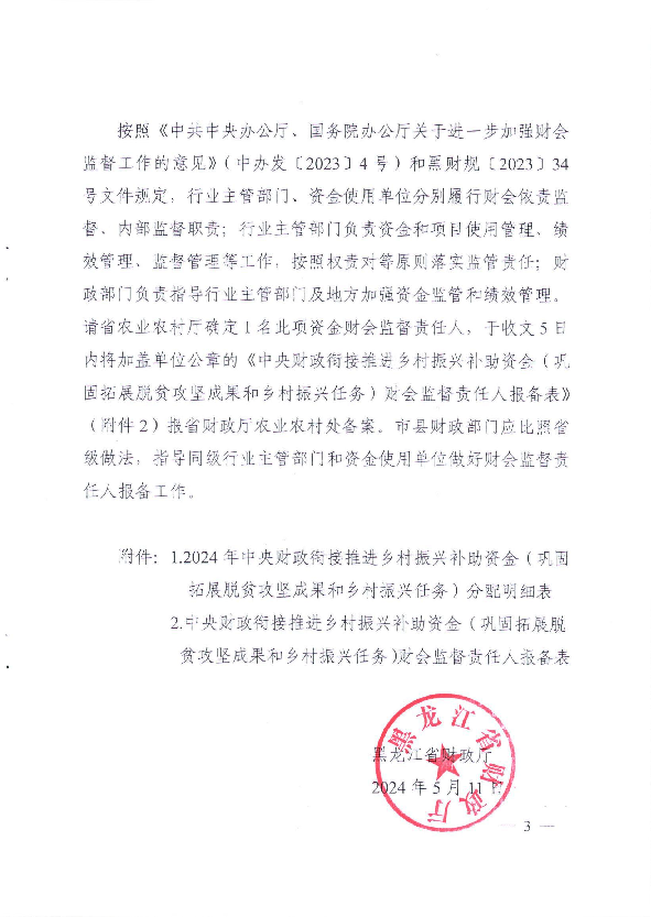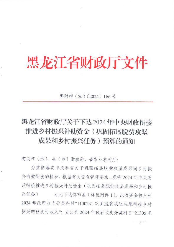 黑龙江省财政厅关于下达2024年中央财政衔接推进乡村振兴补助资金(巩固拓展脱贫攻坚成果和乡村振兴任务)预算的通知(黑财指(农)〔2024〕166号)