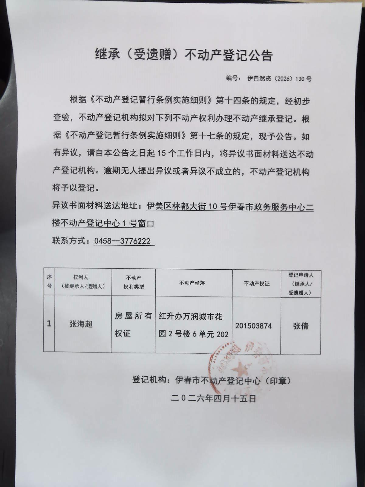 继承(受遗赠)不动产登记公告 伊自然资(2026)130号
