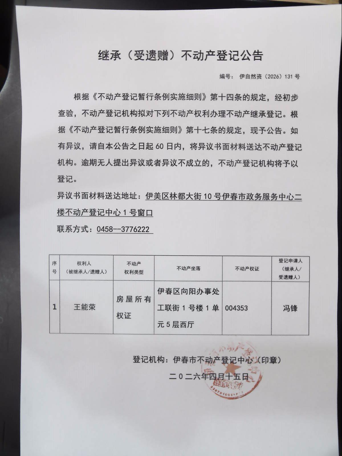 继承(受遗赠)不动产登记公告 伊自然资(2026)131号