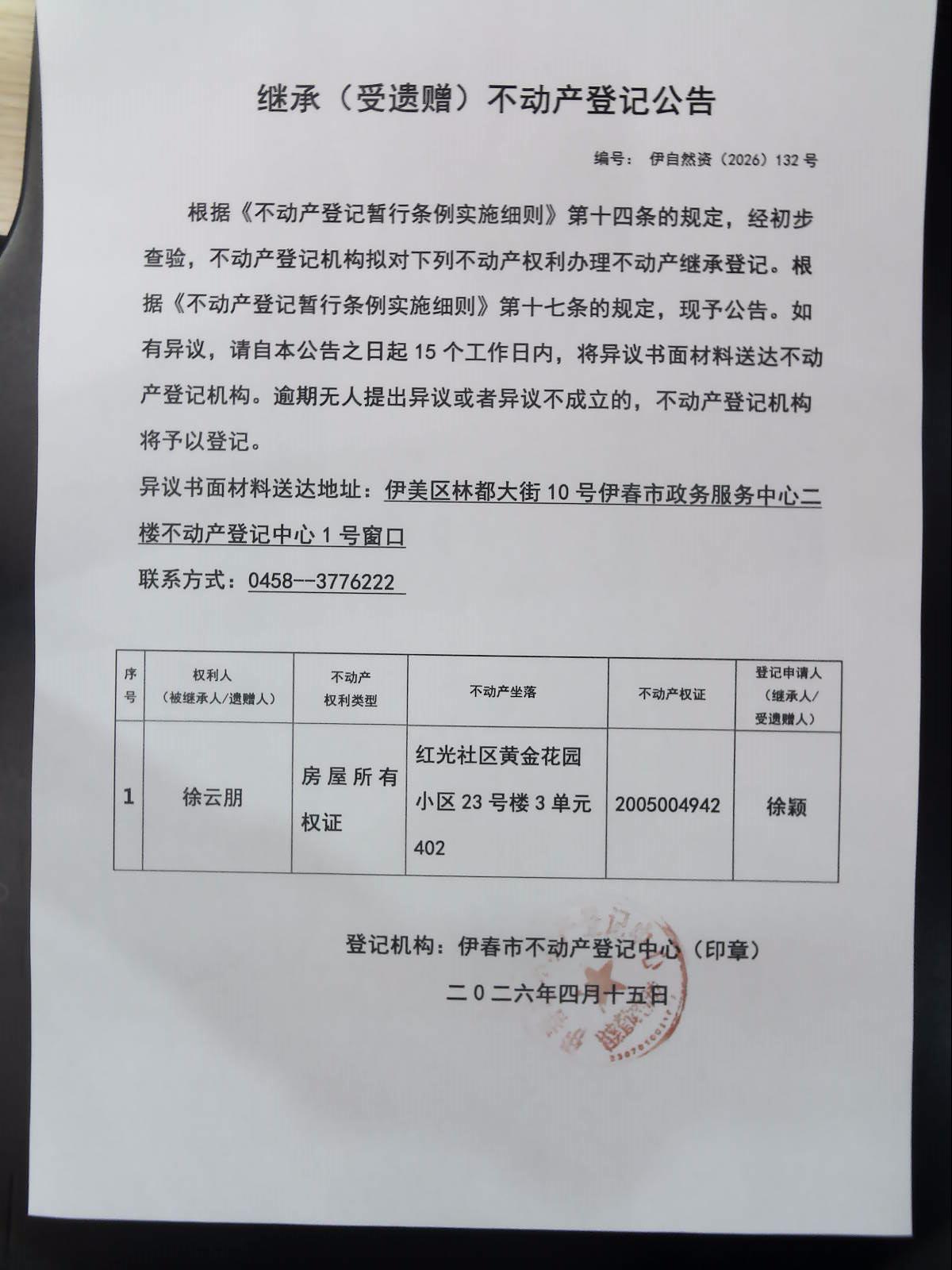 继承(受遗赠)不动产登记公告 伊自然资(2026)132号