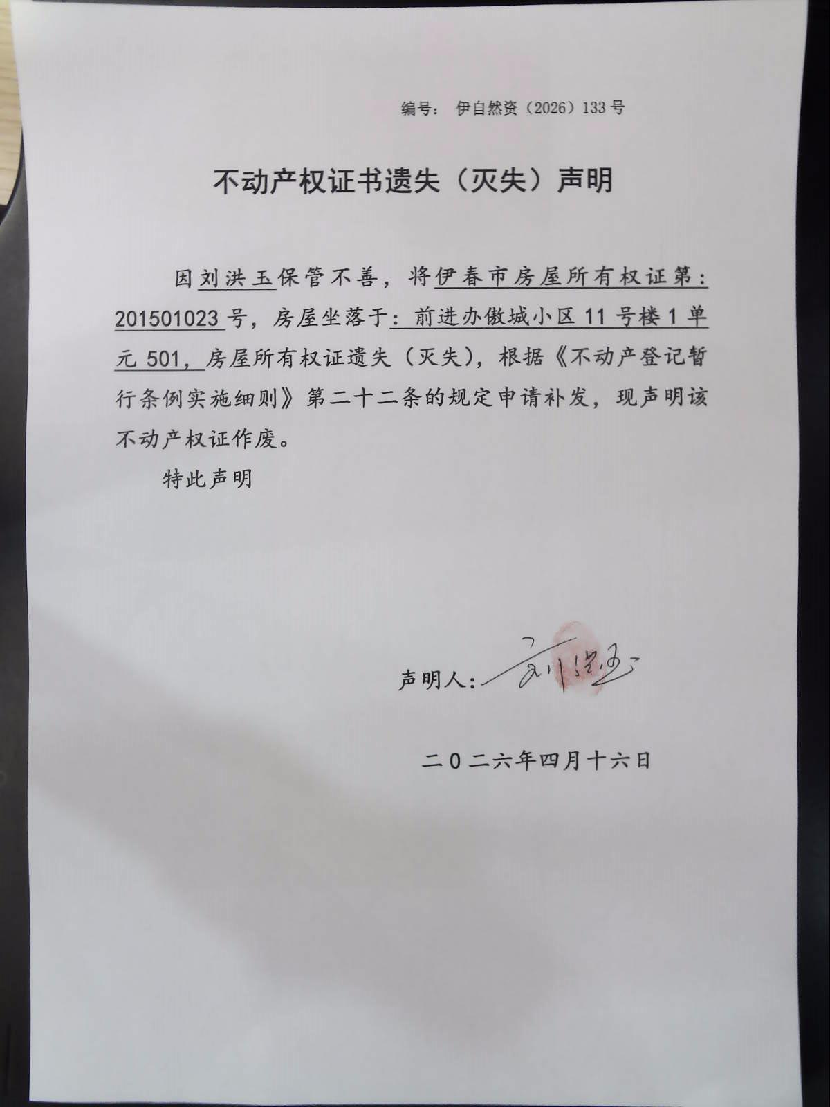 不动产权证遗失(灭失)声明 伊自然资(2026)133号