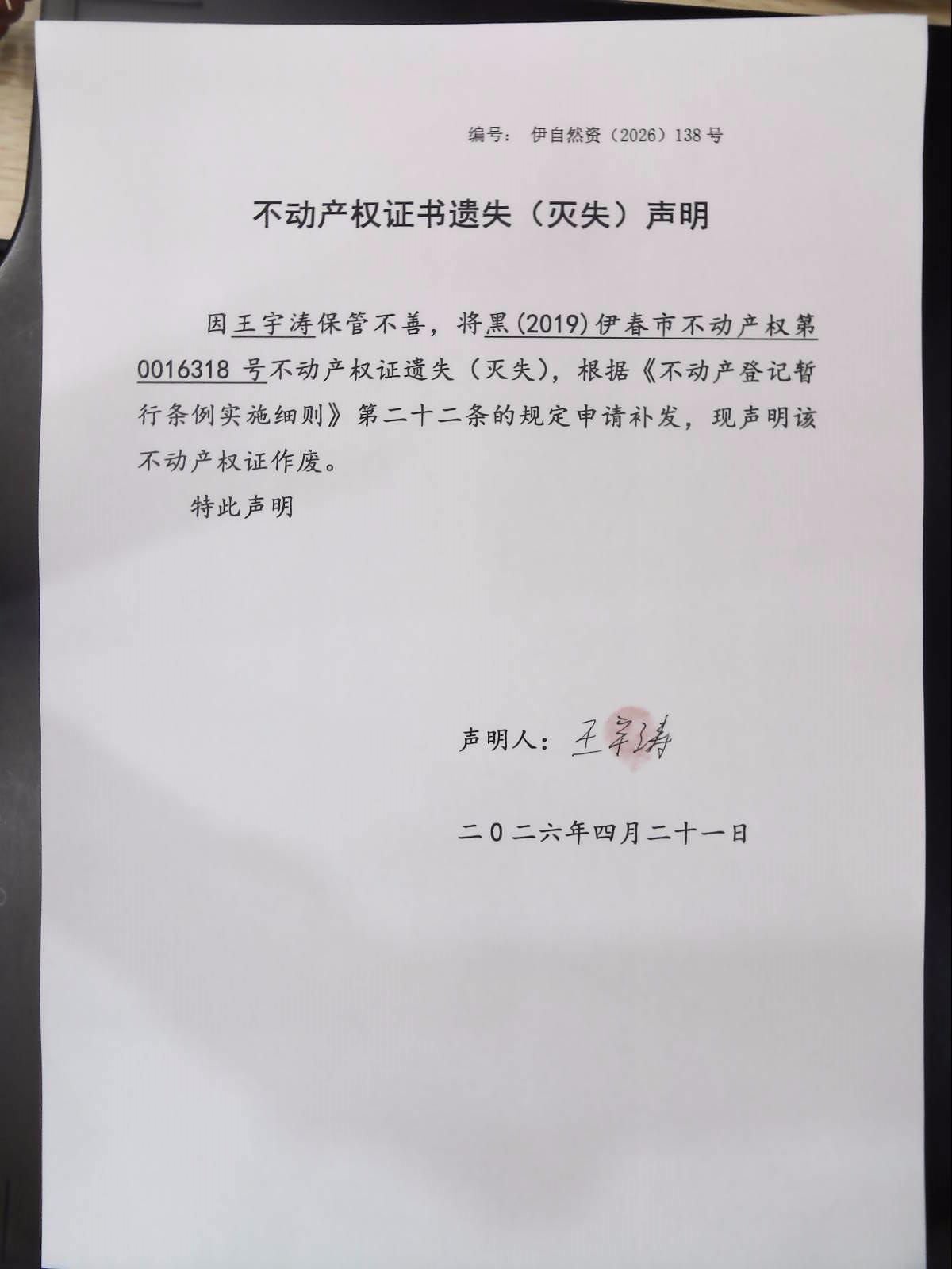 不动产权证书遗失(灭失)声明 伊自然资(2026)138号