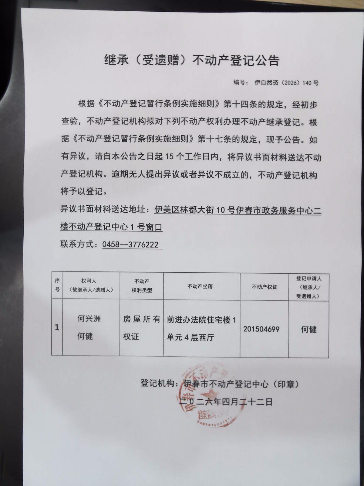 继承(受遗赠)不动产登记公告 伊自然资(2026)140号