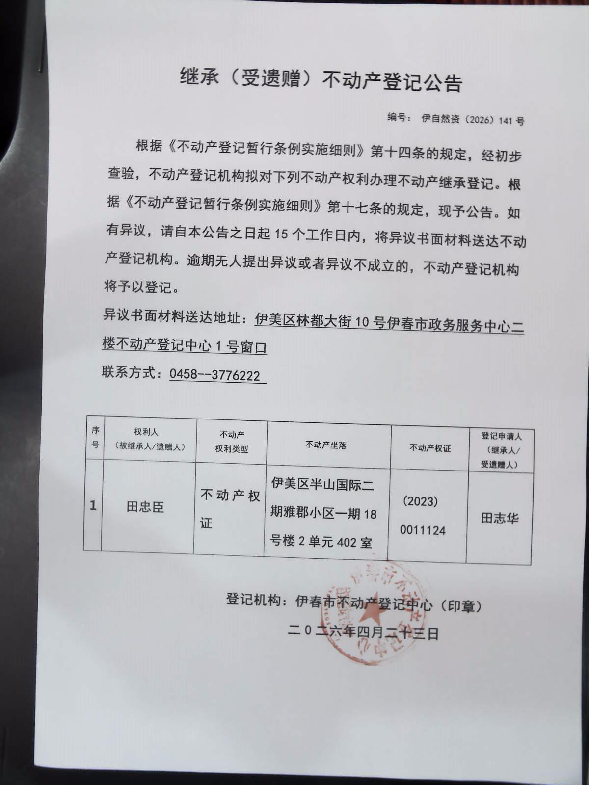 继承(受遗赠)不动产登记公告 伊自然资(2026)141号