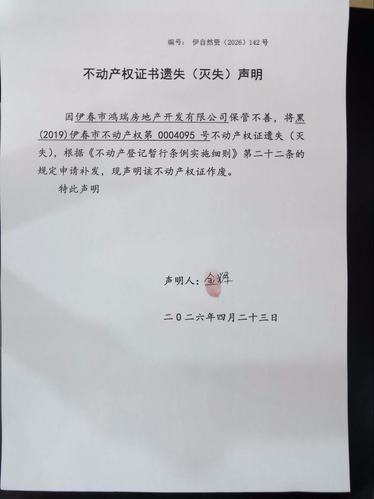 不动产权证书遗失(灭失)声明 伊自然资(2026)142号