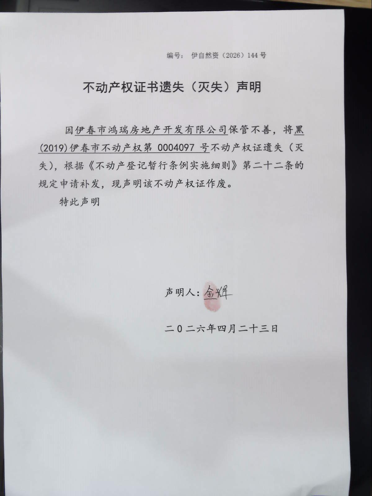 不动产权证书遗失(灭失)声明 伊自然资(2026)144号