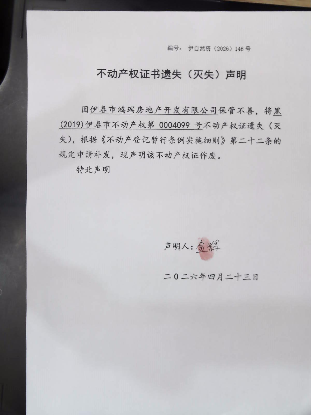 不动产权证书遗失(灭失)声明 伊自然资(2026)146号