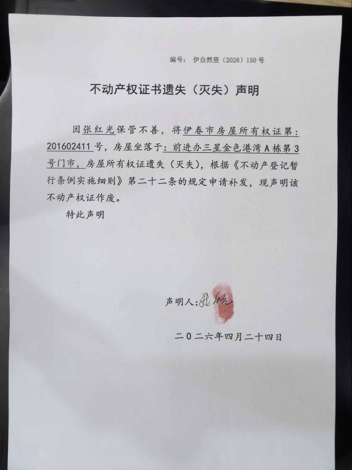 不动产权证书遗失(灭失)声明 伊自然资(2026)150号