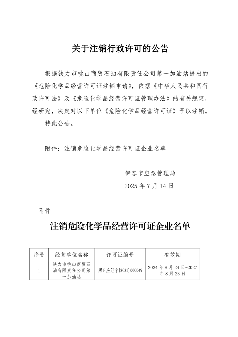 关于注销铁力市桃山商贸石油有限责任公司第一加油站危险化学品经营许可证行政许可的公告
